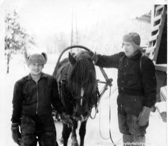 14-vuotias Voitto Nieminen (s. 16.10.1945) isänsä Heikki Niemisen (16.6.1910 - 21.4.1967) ja Lahja-hevosen kanssa koivun ajossa Rossin pihassa.