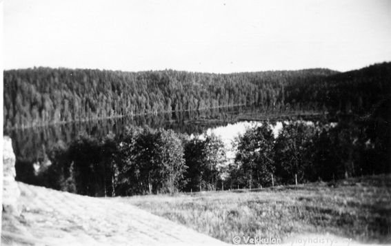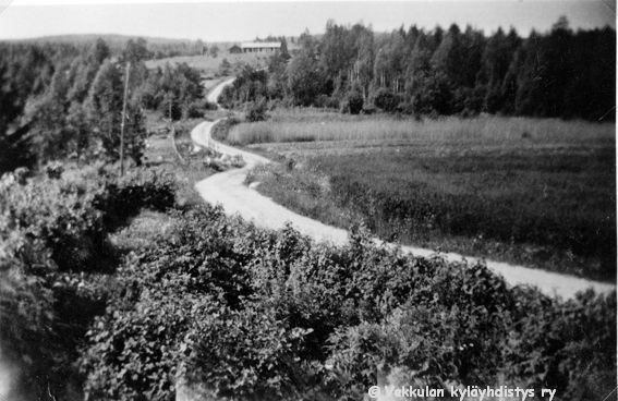 30 Tien oikealla puolella Lepsalan eli Järvenpään peltoa, metsänrajassa suunnilleen Lepsalan ja Kerpolan raja, keskellä takana näkyy kaksi rakennusta, Kerpola ja Kerpolan aitan pääty