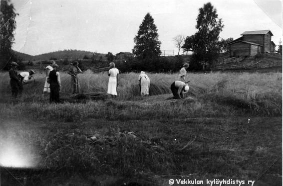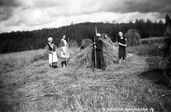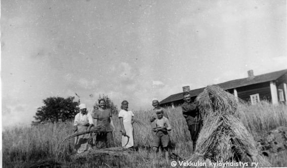 10 Rukiinkorjuussa Kerpolassa vasemmalta Kerpolan pikkukamarissa asunut kuppari-hieroja-lapsenpäästäjä Hilma Reth (sukunimeä on kirjoitettu myös asussa Reht) eli "Riitin Hilma", Kerpolan emäntä Olga Ahlgren (o.s. Peltonen, 12.4.1901 - 12.1.1986), naapuritalo Lepsalasta (myöhempi nimi Järvenpää) hyvänä laulajan muistettu Lyyli Reijonen (s. n. 1920, myöhemmin Vainio) ja Kosti Reijonen, sekä Tauno Salonen (sirppi kädessä) ja oikealla Olgan aviomies Hjalmar Ahlgren (19.11.1893 - 17.9.1964).