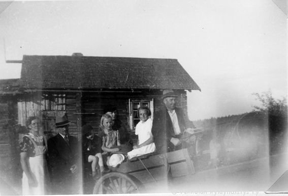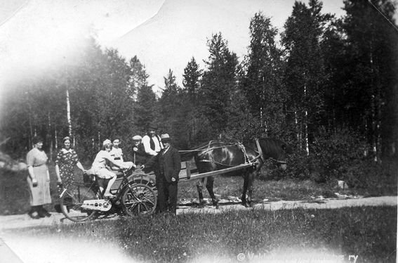 22 Kerpolassa Ahlgreneilla vieraillut vaasalainen Geijerin perhe lähdössä kotiin: Seisomassa vasemmalla siskokset Iida Geijer ja Olga Ahlgren (o.s. Peltonen, 12.4.1901 - 12.1.1986), oikealla Iidan aviomies Einar (kutsumanimi Eino) Geijer (1894 - 1979). Syntymäpäivälahjaksi saadun polkupyöränsä päällä Kyllikki Ahlgren (myöhemmin Rantanen, s. 6.12.1927), Kerttu-hevosen kärryissä Geijerien lapset Marjatta (myöhemmin Rantamäki, s. 1925 tai 1926) ja Reino (1932 - 1993) sekä ohjaksissa Kerpolan isäntä Hjalmar Ahlgren (19.11.1893 - 17.9.1964).