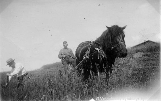 13 Langokset Einar (kutsumanimi Eino) Geijer (1894 - 1979, niittämässä) ja Kerpolan isäntä Hjalmar Ahlgren (19.11.1893 - 17.9.1964), hevosen ohjaksissa) heinän kaadossa Kerpolassa Kerttu-hevosen kanssa.