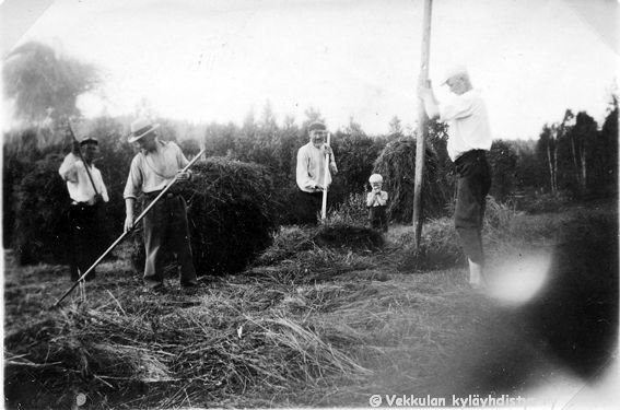 14 Vasemmalta Kerpolan pikkumökissä asunut Nestori Koljander, Kerpolan emännän siskonmies Einar (kutsumanimi Eino) Geijer (1894 - 1979) Vaasasta, Kerpolan vanha isäntä Severus Ahlgren (22.12.1866 - 27.5.1939) eli Veeru-pappa, Einon poika Reino Geijer (1932 - 1993) ja Severuksen pojanpoika Sune Ahlgren (1922 - 1982) laittamassa heinää seipäille Kerpolassa.