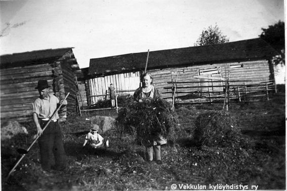 15 Vaasalainen Geigerin perhe heinätöissä Ahlgreneilla Kerpolassa: isä Einar (kutsumanimi Eino, 1894 - 1979), poika Reino (1932 - 1993), äiti Iida (o.s. Peltonen, Kerpolan emännän Olga Ahlgrenin sisko) ja takana tytär Marjatta (myöhemmin Rantamäki, s. 1925 tai 1926) Geijer