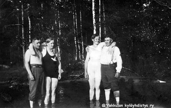 16 Kotijärven rantavedessä seisomassa kaksi avioparia: Vaasasta vierailulla olevat Einar (kutsumanimi Eino, 1894 - 1979) ja Iida Geijer sekä Iidan sisko Kerpolan emäntä Olga Ahlgren (o.s. Peltonen, 12.4.1901 - 12.1.1986) ja hänen aviomiehensä Hjalmar Ahlgren (19.11.1893 - 17.9.1964