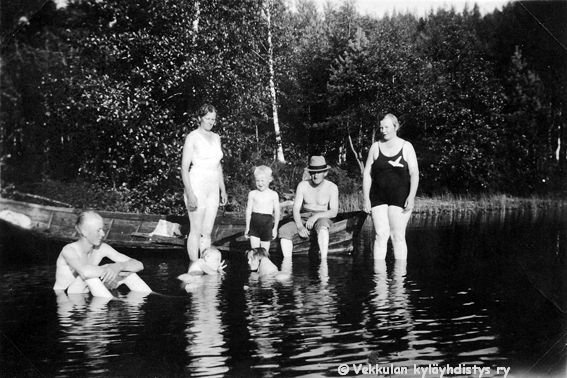 17 Kotijärven rantavedessä veneen ääressä vasemmalta Kerpolan poika Sune (1922 - 1982), Sunen ja Kyllikin äiti Olga (o.s. Peltonen, 12.4.1901 - 12.1.1986) ja Kyllikki (myöhemmin Rantanen, s. 6.12.1927) Ahlgren (Reinon edessä), sekä Kerpolassa Ahlgreneilla vierailulla oleva vaasalainen Geijerin perhe: poika Reino (1932 - 1993), isä Einar (kutsumanimi Eino, 1894 - 1979), tytär Marjatta (myöhemmin Rantamäki, s. 1925 tai 1926, Olgan edessä) ja äiti Iida Geijer (o.s. Peltonen, Olgan sisko).