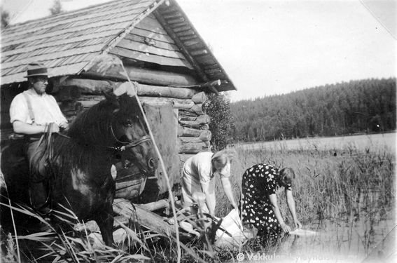 18 Vaasasta vierailulla oleva Iida Geijer (vaaleassa asussa), poikansa Reinon (1932 - 1993) ja sisarensa Kerpolan emäntä Olga Ahlgrenin (o.s. Peltonen, 12.4.1901 - 12.1.1986, tummassa mekossa) kanssa pyykillä Kotijärven rantavedessä venetalaksen ovella. Vasemmalla Kerttu-hevosen selässä Olgan aviomies Hjalmar Ahlgren (19.11.1893 - 17.9.1964).