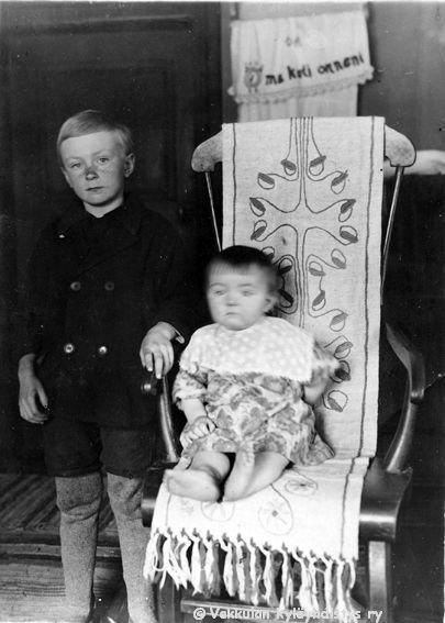19 Vasemmalla seisomassa Kerpolan poika Sune Ahlgren (1922 - 1982), kirjaillulla liinalla peitetyssä keinutuolissa istumassa Sunen sisko Kyllikki Ahlgren (myöhemmin Rantanen, s. 6.12.1927).
