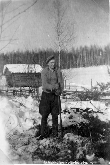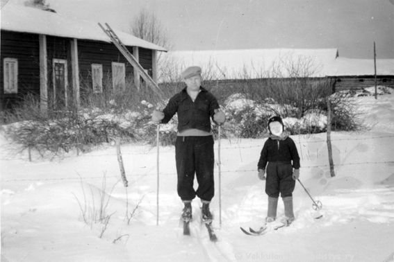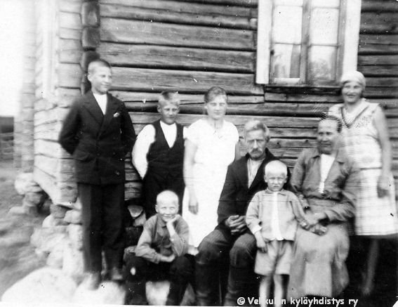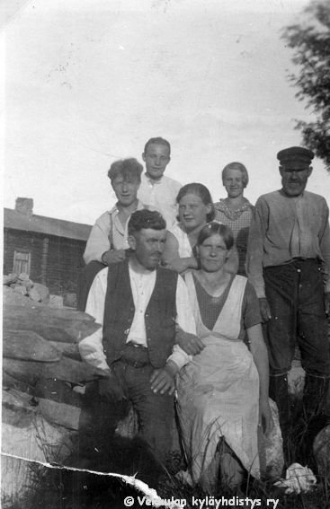 2 Edessä Kerpolan isäntä Hjalmar Ahlgren(19.11.1893 - 17.9.1964) ja vaimonsa Olga Ahlgren (o.s. Peltonen, 12.4.1901 - 12.1.1986), lippalakki päässä oikealla Hjalmarin isä Severus Ahlgren (22.12.1866 - 27.5.1939) eli Veeru-pappa. Takimmaisena Ahlgrenien kasvattitytär Toini Salonen (myöhemmin Sneck) ja hyvänä laulajana muistettu naapuritalo Lepsalan (myöhempi nimi Järvenpää) tytär Lyyli Reijonen (s. n. 1920, myöhemmin Vainio), sekä kaksi tunnistamatonta miestä. Taustalla näkyy Kerpolan talo.