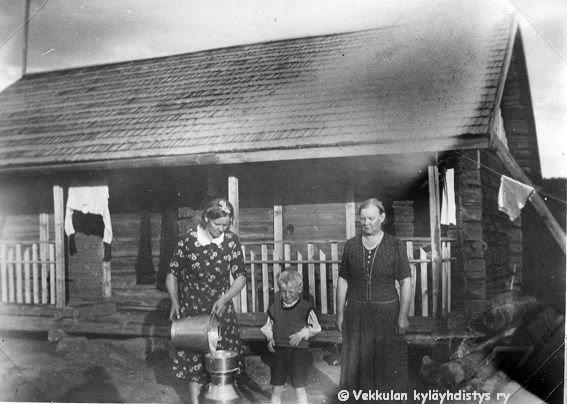 20 Vasemmalla Kerpolan emäntä Olga Ahlgren (o.s. Peltonen, 12.4.1901 - 12.1.1986) siivilöi maitoa, oikealla seisoo vierailulla oleva Olgan sisko Iida Geijer Vaasasta ja lapsi keskellä on Iidan poika Reino Geijer (1932 - 1993).