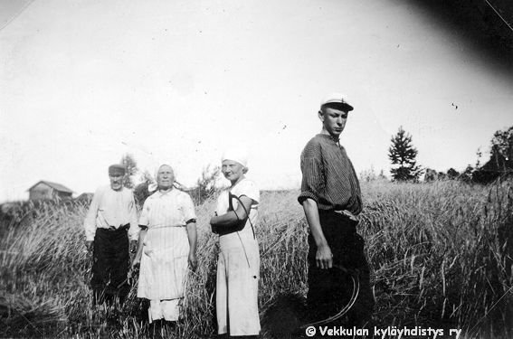 24 Rukiin leikkuussa vasemmalta Kerpolan vanha isäntä Severus Ahlgren (22.12.1866 - 27.5.1939) eli Veeru-pappa, Kerpolan pikkukamarissa asunut kuppari-hieroja-lapsenpäästäjä Hilma Reth (sukunimeä on kirjoitettu myös asussa Reht) eli "Riitin Hilma", hyvänä laulajana muistettu naapuritalo Lepsalan (myöhempi nimi Järvenpää) tytär Lyyli Reijonen (s. n. 1920, myöhemmin Vainio) ja Veerun pojanpoika 16-vuotias Sune Ahlgren (1922 - 1982).