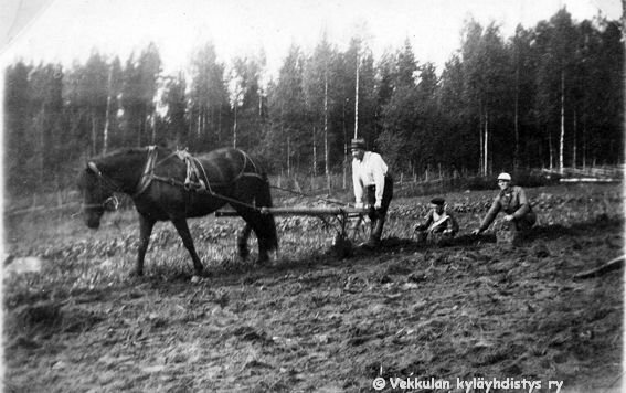 25 Sähäkkä-hevosta ohjastava Kerpolan isäntä Hjalmar (19.11.1893 - 17.9.1964), tytär Kyllikki (myöhemmin Rantanen, s. 6.12.1927) ja emäntä Olga (o.s. Peltonen, 12.4.1901 - 12.1.1986) Ahlgren perunan istutuksessa Kerpolassa