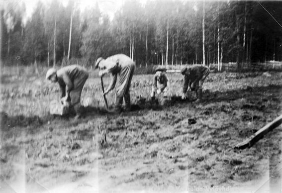 26 Neljä henkilöä perunannostossa Kerpolassa: yhdellä on kuokka, kolme kerää perunoita pärekoreihin. Taustalla riukuaikaa ja metsää. Oikealla todennäköisesti Kerpolan vanha isäntä Severus Ahlgren (22.12.1866 - 27.5.1939) eli Veeru-pappa ja edessään pojantyttärensä Kyllikki Ahlgren (myöhemmin Rantanen, s. 6.12.1927), kaksi muuta tunnistamattomia.