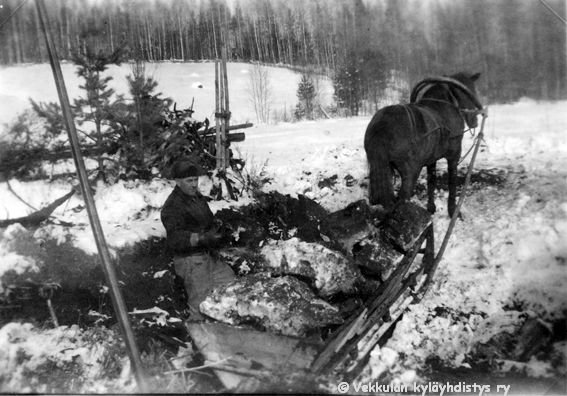 31 Kerpolan isäntä Hjalmar Ahlgren (19.11.1893 - 17.9.1964) nostaa turvetta Kerttu-hevosen rekeen turvesuolla Kerpolan rannassa Kotijärven rannassa.