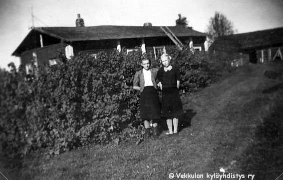 33 Serkukset: vasemmalla Kyllikki Ahlgren (myöhemmin Rantanen, s. 6.12.1927) ja Vaasasta vierailulla oleva Marjatta Geijer (myöhemmin Rantamäki, s. 1925 tai 1926) seisovat Kyllikin kodin Kerpolan pihalla