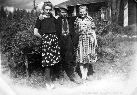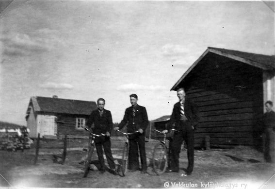 35 Kolme poikaa polkupyörineen, vasemmalta Sunen ystävät Impivaaran talon poika Jaakko Silvan, Männistön talon poika Paavo Salminen ja sitten Kerpolan poika Sune Ahlgren (1922 - 1982), oikeassa reunassa joku Kerpolassa evakkoina asuneen Ampujan perheen pojista, mahdollisesti Jaakko?