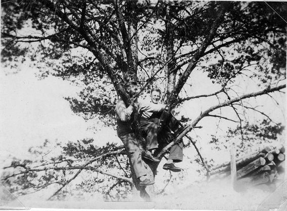 36 Korkealla puussa istuvat oikealla Kerpolan poika Sune Ahlgren (1922 - 1982) ja vasemmalla hänen ystävänsä Lauri Salminen (3.12.1920 - 16.12.1975) Männistöltä.