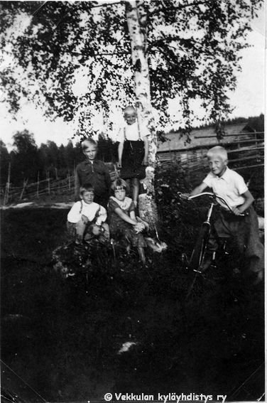 38 Koivun vierellä keskellä edessä Kyllikki Ahlgren (myöhemmin Rantanen, s. 6.12.1927), A. Ollikainen, mahdollisesti naapuritalo Kytömäen veljekset Martti Suominen ja Kalle Suominen, oikealla polkupyörän kanssa naapuritalo Lepsalan (myöhemmin Järvenpää) poika Jaakko Reijonen,