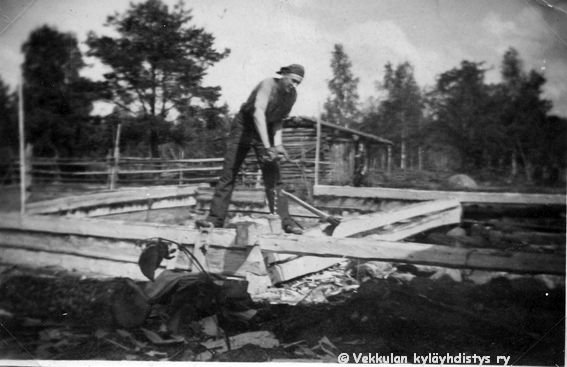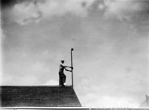 43 Sune Ahlgren (1922 - 1982) seisoo kotinsa Kerpolan aitan katolla pitäen kiinni tuuliviiristä, ilmeisesti pystyttää sitä.