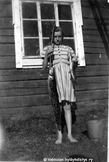 44 Isoveljensä Sunen herättämä Kyllikki Ahlgren (myöhemmin Rantanen, s. 6.12.1927) seisoo kotinsa Kerpolan talon edessä pidellen Sunen aikaisin aamulla Kotijärvestä saamaa kalansaalista, vasemmassa kädessä isoa madetta, oikeassa haukea.
