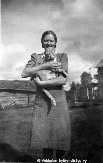 45 Emäntä Olga Ahlgren (o.s. Peltonen,12.4.1901 - 12.1.1986) seisoo kotinsa Kerpolan pihalla kissa sylissään,