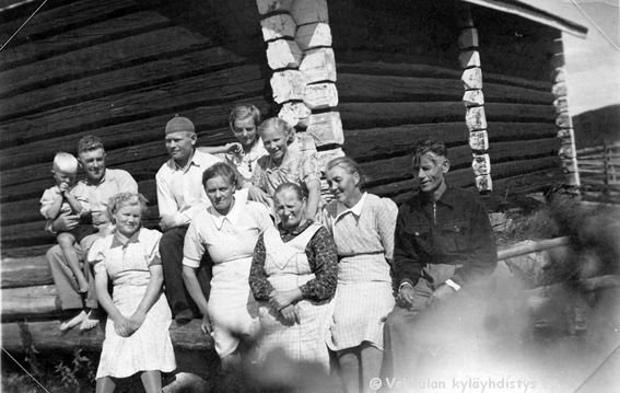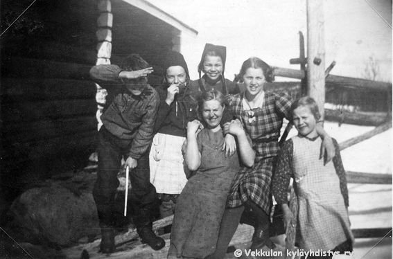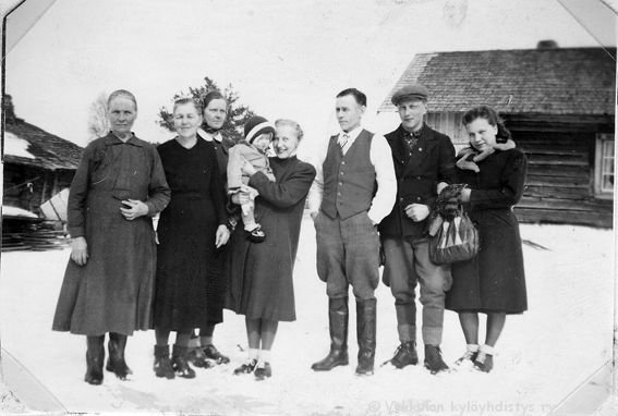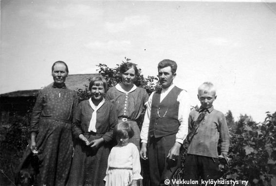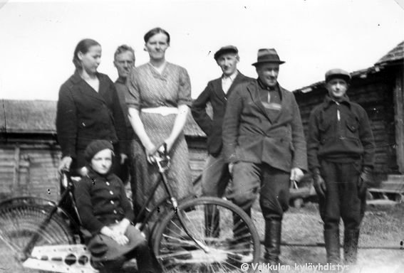 7 Vasemmalta Ilmi Huusko (myöhemmin Rokkanen, s. 1.9.1916), Kerpolan pikkumökissä asunut Nestor Koljander, Kerpolan emäntä Olga Ahlgren (o.s. Peltonen, 12.4.1901 - 12.1.1986), (etunimi?) Lyytinen, Olgan aviomies Hjalmar Ahlgren (19.11.1893 - 17.9.1964) ja naapuritalo Kytömäen poika Martti Suominen, edessä polkupyörän rungolla istumassa Olgan ja Hjalmarin tytär Kyllikki Ahlgren (myöhemmin Rantanen, s. 6.12.1927).
