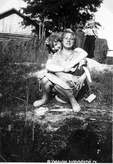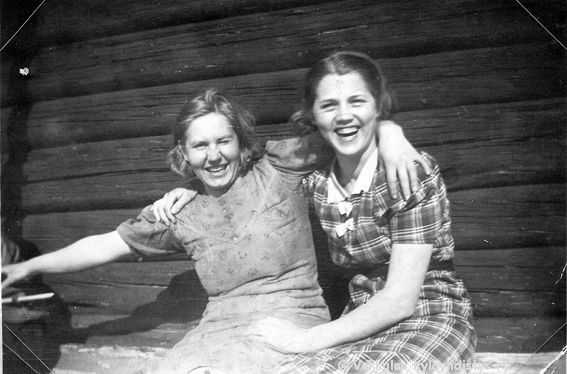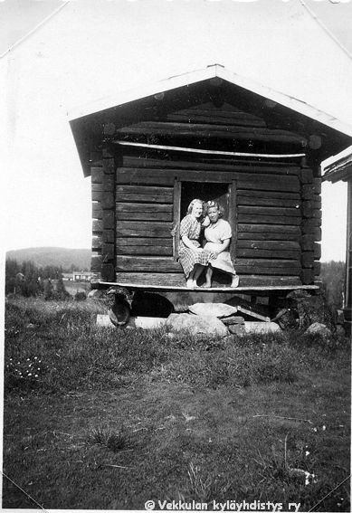 58 Oikealla Maire Ilkka ja vasemmalla Ahlgrenien kesävieras Vaasasta Marjatta Geijer (myöhemmin Rantamäki, s. 1925 tai 1926) istuvat Kerpolan aitan oviaukolla, taustalla maisemassa näkyy naapuritalo Järvenpää (aiempi nimi Lepsala).