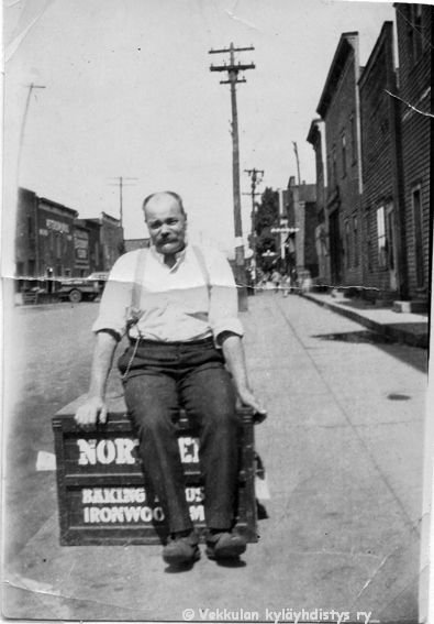 5 Kadulla laatikon päällä istumassa leipuri Juho eli John Rikhard Ahlgren (17.3.1873 - ).