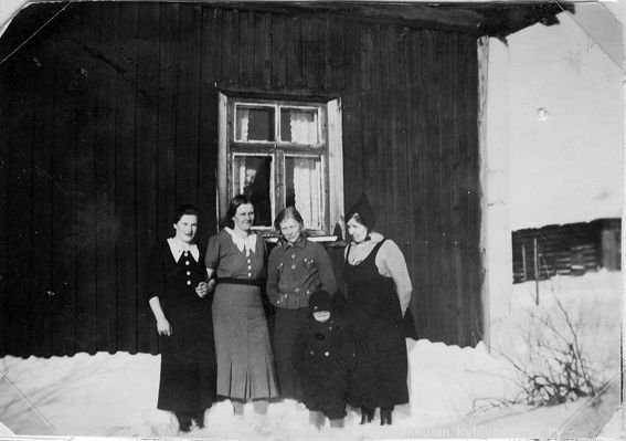 51 Sotatalvena Kerpolan talon edessä seisovat vasemmalta naapuritalo Järvenpään (aiempi nimi Lepsala) Marjatta Laitinen, Kerpolan emäntä Olga Ahlgren (o.s. Peltonen, 12.4.1901 - 12.1.1986), Kerpolassa evakkona asunut Aili Nio, (etunimi?) Hokkanen (Helvi Hokkasen äiti), ja lapsi Ailin poika Veijo Nio. Sisältä ikkunasta verhon takaa kurkistaa joku.