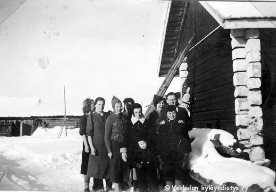53 Aitan päädyn vierellä lumessa seisovat vasemmalta Ahlgrenien kasvattitytär Toini Salonen (myöhemmin Sneck), naapuritalo Järvenpään (aiempi nimi Lepsala) emäntä Marjatta Laitinen, Kerpolassa asuneet karjalaiset evakot Aili Nio ja poikansa Veijo Nio, Kerpolan tytär Kyllikki Ahlgren (myöhemmin Rantanen, s. 6.12.1927) ja hänen äitinsä Olga Ahlgren (o.s. Peltonen, 12.4.1901 - 12.1.1986) <-- Kallen takana, (etunimi?) Hokkanen eli Helvin ja Kallen äiti, sekä sisarukset Helvi Hokkanen (Kyllikin takana) ja Kalle Hokkanen (edessä).