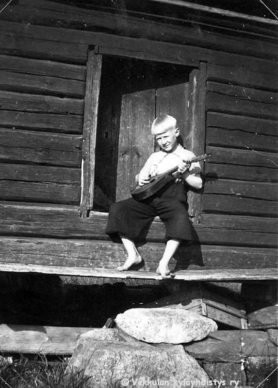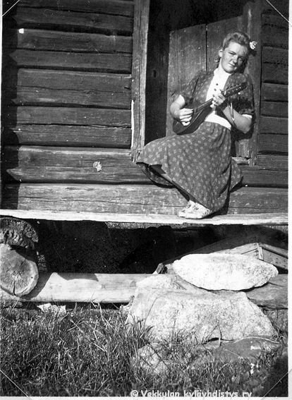 57 Kyllikki Ahlgren (myöhemmin Rantanen, s. 6.12.1927) istuu kotinsa Kerpolan aitan oviaukolla käsissään mandoliini (jonka Kyllikki myöhemmin maalasi kirjavaksi)
