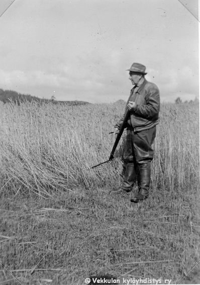 61 Kerpolan isäntä Hjalmar Ahlgren (19.11.1893 - 17.9.1964) niittämässä ruista viikatteella Kerpolan pellolla viimeistä kertaa myytyään Kerpolan Jämsän metsänhoitoyhdistykselle keväällä 1955.