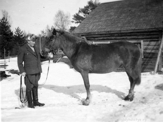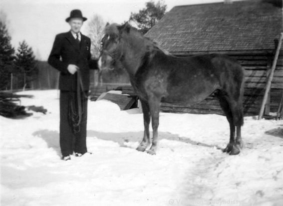62 Sune Ahlgren (1922 - 1982) puku päällä hattu päässä pitelee Sähäkkä-hevosta ohjaksista lapsuudenkotinsa Kerpolan pihassa.