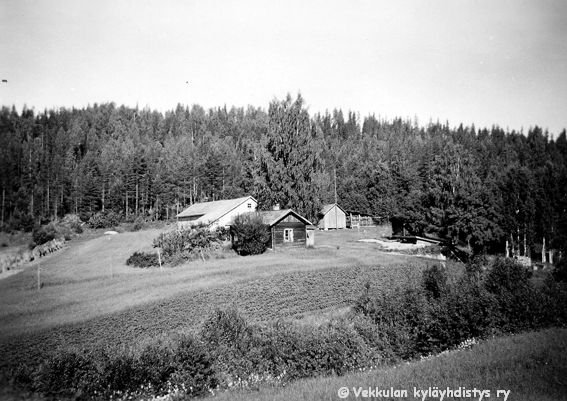 68 Hietala maisemakuvassa, päärakennus vielä vuoraamaton, lautavuoraus tehtiin aivan 50-luvun lopussa tai 60-l alussa. Vaalea rakennus navetta, jonka päässä heinäliiteri, oikealla "romuliiteri", matala oikeassa reunassa maakellarin katto (kellari rakennettu aikaisintaan 56)