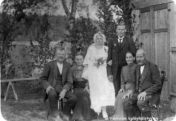 8 Hääkuva: Vasemmalla istuvat morsiamen vanhemmat Otto ja Iida Peltonen, keskellä seisoo hääpari Hilda (o.s. Peltonen, 1890 - 1975) ja Sulo Viren (1891 - 1957), ja oikealla istuvat sulhasen vanhemmat Virenit.
