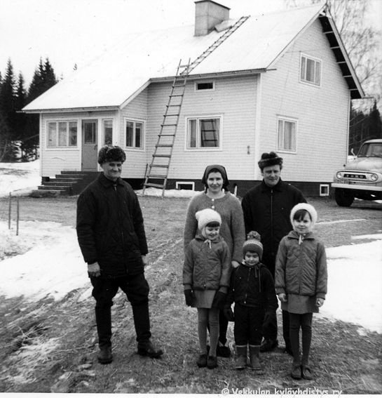 Paavo Lehtinen eli Pitkälän Paavo poikansa Veikon perheen kanssa uuden Pitkälän talon edustalla.